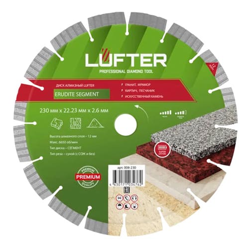 Диск алмазный lufter erudite segment 230x2.6х12 мм гранит, мрамор, камень, песчаник 008-230