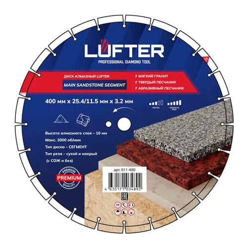 Диск алмазный lufter main sandstone segment 400мм х 25.4 x 3.5мм х 10мм твердый песчаник, мяг грани 011-400