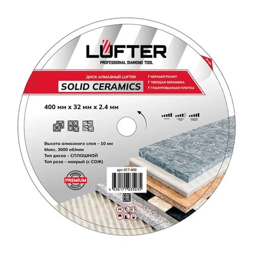 Диск алмазный lufter solid ceramics 400х32x2.2х10 мм wet сплошной, твердая керамика, керамогранит 017-400