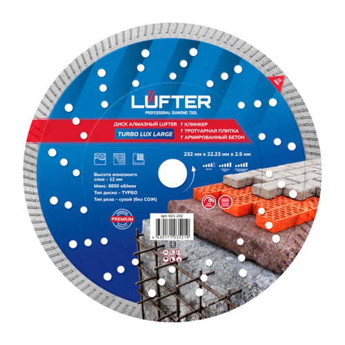 Диск алмазный lufter turbo lux large 232x2.5х12 мм тратуарная плитка, армированый бетон, все виды кирпича 021-232