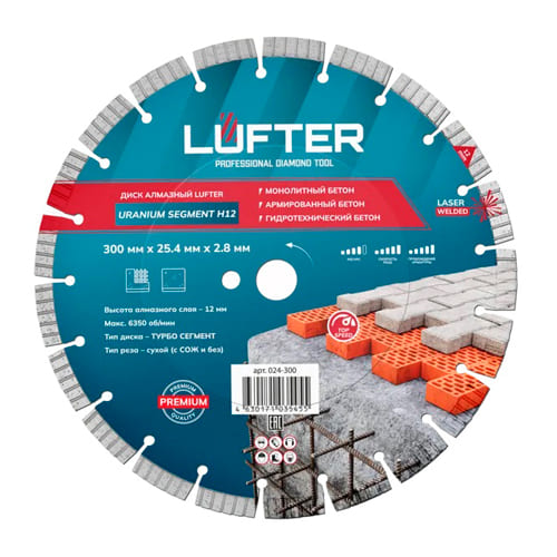 Диск алмазный lufter uranium segment h12 300x2.8х25.4 мм монолитный, армированный бетон, гидротехнический бетон 024-300