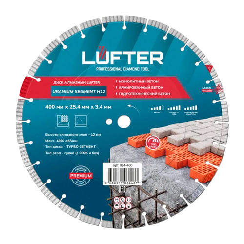 Диск алмазный lufter uranium segment h12 400x3.5х25.4 мм монолитный, армированный бетон, гидротехнический бетон 024-400