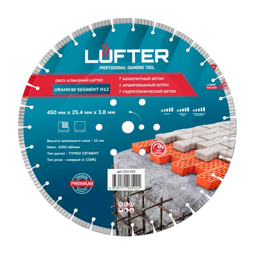 Диск алмазный lufter uranium segment h12 450x3.8х25.4 мм монолитный, армированный бетон, гидротехнический бетон 024-450