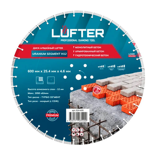 Диск алмазный lufter uranium segment h12 600x4.5х25.4 мм монолитный, армированный бетон, гидротехнический бетон 024-600