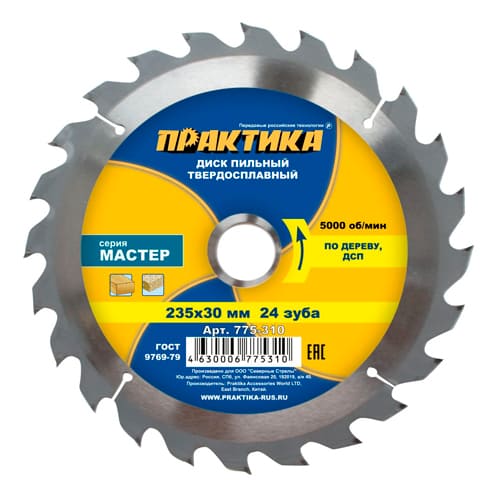 Диск пильный твёрдосплавный по дереву, ДСП 235 х 30 мм, 24 зуба, Практика