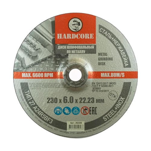 Диск шлифовальный по металлу/нержавеющей стали "Hardcore" (230 х 6 х 22,23 мм)