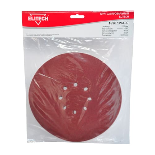 Круг шлифовальный 225 мм, Р80, 5шт, липучка, 8 отверстий, ELITECH 1820.126100