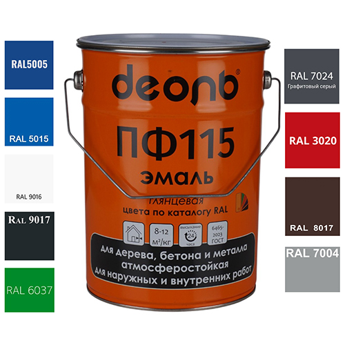 Эмаль ПФ-115 глянцевая предназначена для окрашивания деревянных, металлических, оштукатуренных поверхностей, эксплуатирующихся в атмосферных условиях и внутри помещений. Покрытие отличается устойчивостью к износу и воздействию моющих средств, содержащих хлор. Подходит для окраски в детских дошкольных, учебных, лечебно-профилактических учреждениях и других помещениях с предусмотренным режимом влажной дезинфекции.