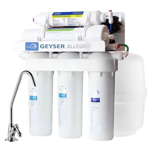 Фильтр обратного осмоса Гейзер Аллегро П с баком 12л оснащен полупроницаемой мембраной, которая пропускает только молекулы воды, задерживая примеси, бактерии и вирусы.