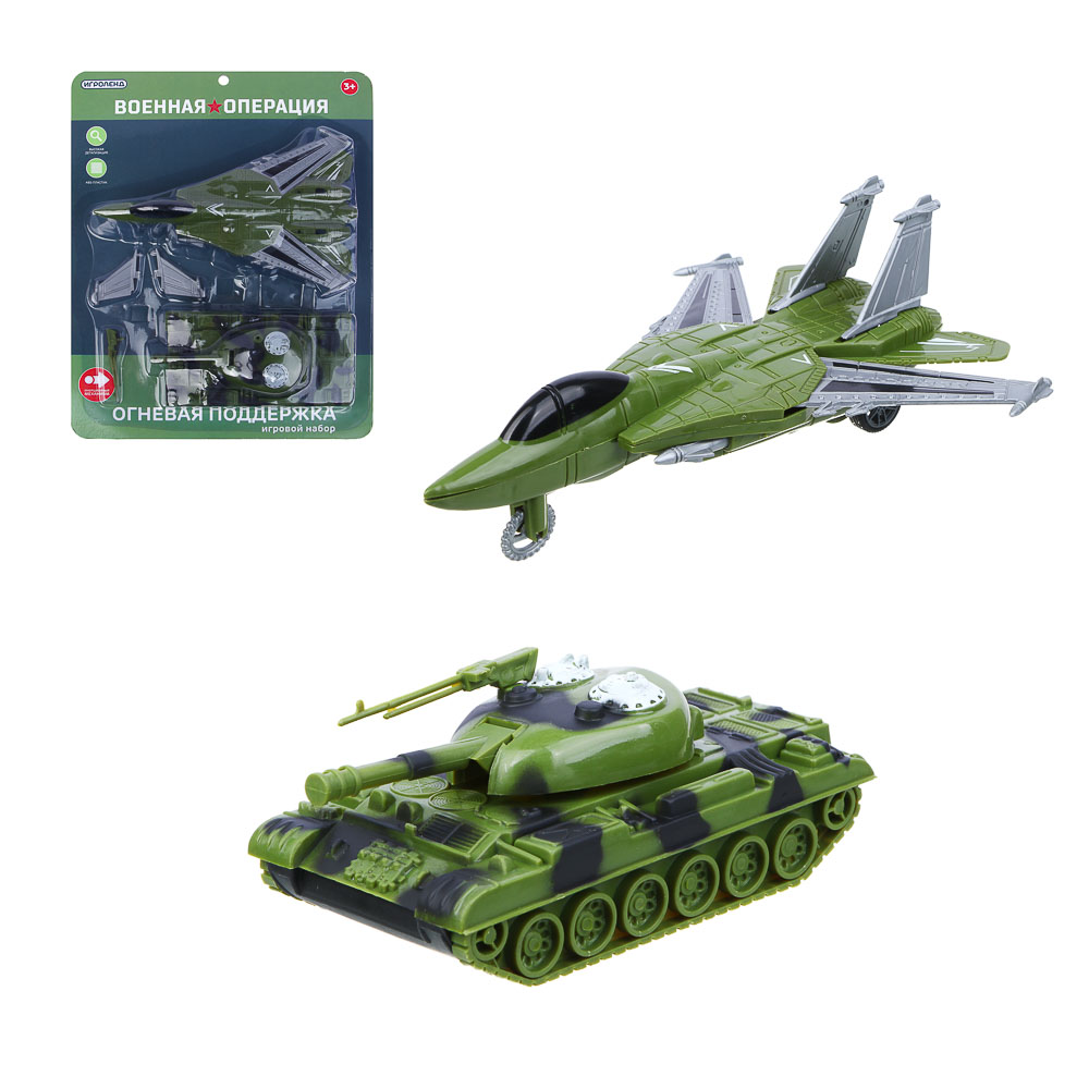 Игровой набор ИГРОЛЕНД Военная операция "Огневая поддержка" включает игрушечную модель самолета и танка с инерционным механизмом. Модели транспорта имеют высокую детализацию и реалистичный дизайн. Выполнены из высокопрочного ABS-пластика без острых краев. Игровой набор станет замечательный подарком для мальчика на любой праздник. Для детей старше 3-х лет.