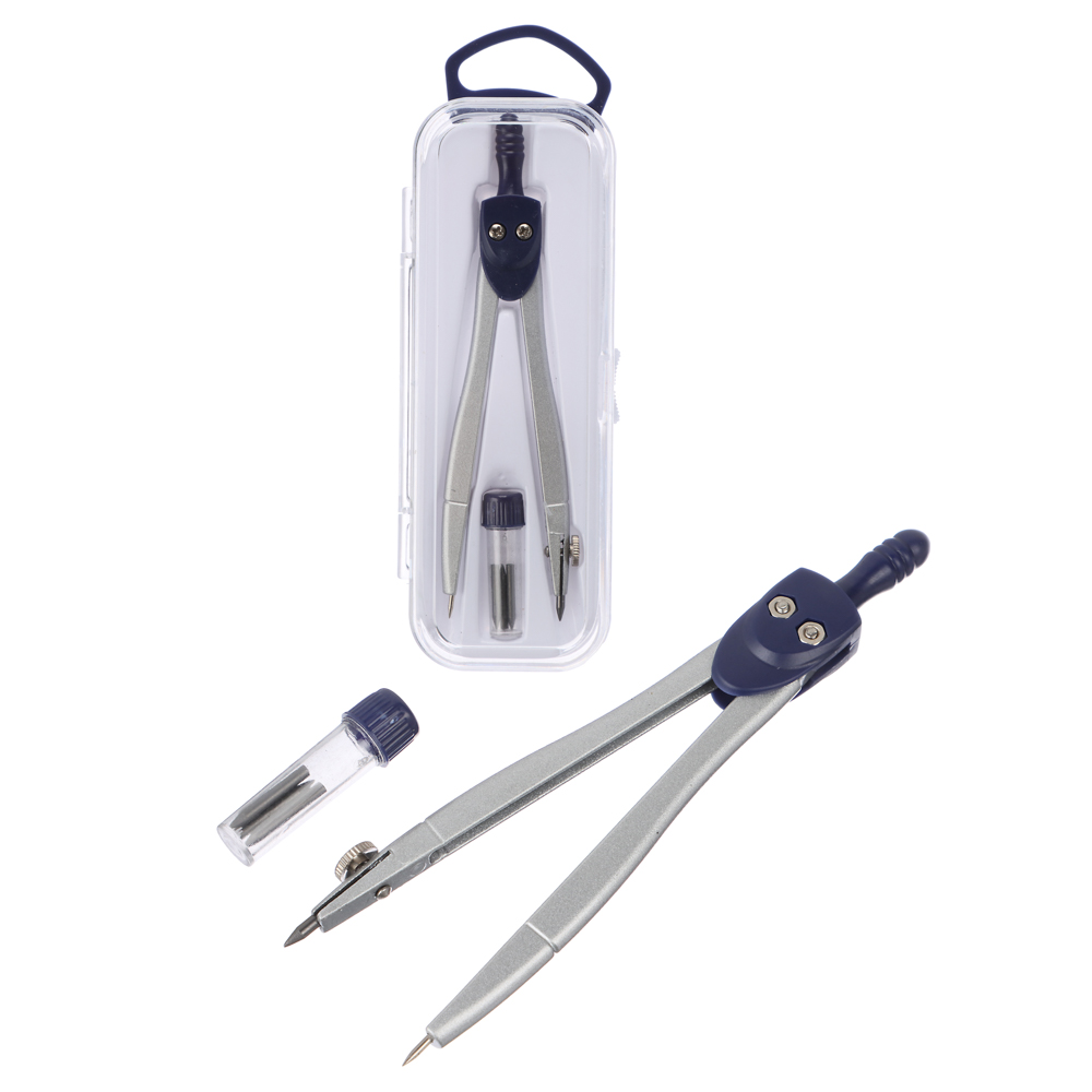 Циркуль — незаменимая канцелярская принадлежность на уроках геометрии и черчения. Инструмент позволяет легко рисовать дуги и круги, измерять расстояния объектов и переносить их на бумагу. Оснащен двумя остроконечными ножками. Благодаря продуманному шарнирному соединению они плавно смыкаются и разводятся. На одной ножке расположена острая металлическая игла, на другой — грифельный стержень с регулировкой длины. В комплекте идет пенал с запасными стержнями.