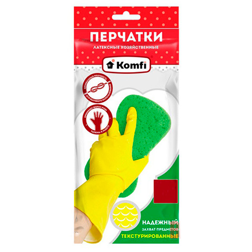 Хозяйственные латексные перчатки Komfi предназначены для защиты рук от мелких повреждений, грязи, краски и мыльных жидкостей. Сетчатая поверхность ладони и пальцев обеспечивает надежный захват скользких предметов и комфотрную работу с мыльными растворами.