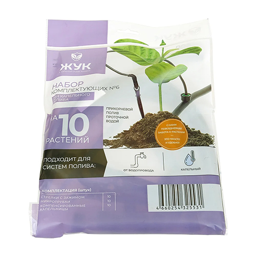 Набор для капельного полива №6 — это оптимальное решение для тех, кто ищет, какой капельный полив выбрать для дачи или огорода. Система рассчитана на 10 растений и подключается напрямую к водопроводу, что избавляет от необходимости носить воду вручную или контролировать наполнение баков. Комплектация включает всё необходимое для быстрой установки: микротрубки, зажимы, капельницы. Пластиковые элементы устойчивы к перепадам температуры и не подвержены коррозии, что особенно важно для использования на открытом воздухе.