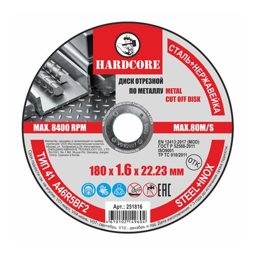 Диск отрезной по металлу/нержавеющей стали "Hardcore" (180 х 1,6 х 22,23 мм)