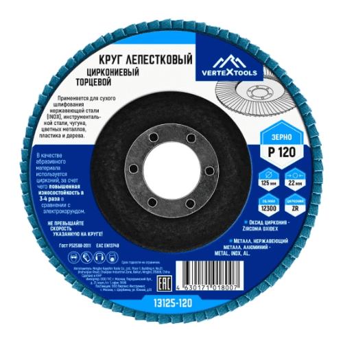 Круг лепестковый торцевой циркониевый 125 мм Р120, vertextools 13125-120