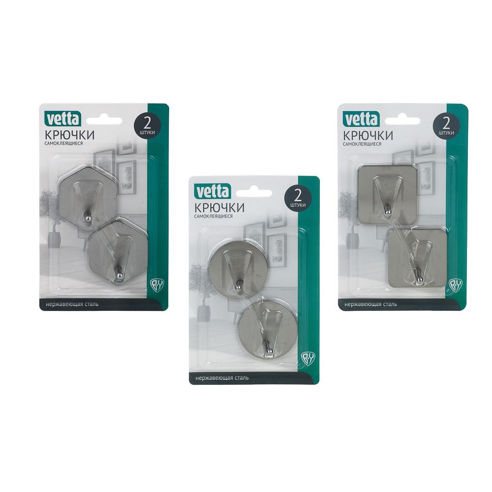 VETTA Крючки самоклеящиеся, 2шт, 4,5x4,5см, нерж.сталь 201, 3 дизайна