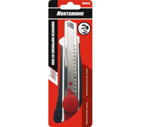 Нож со сменными лезвиями 18 мм "Монтажник" обрезиненный ABS+TPR, винтовой фиксатор