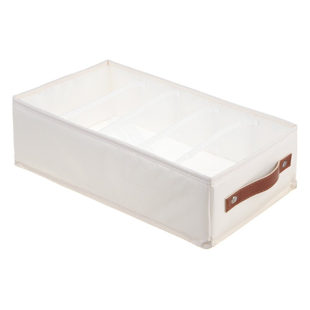 Удобный органайзер с 5 отделениями для хранения одежды и других небольших предметов. Органайзер выполнен из качественного, прочного и при этом дышащего материала. Усиленные боковые стенки не прогибаются и прекрасно держат форму, общее пространство разделено на 5 секций, что позволяет грамотно организовать пространство. Размер 33х16,5х10 см. Органайзер удобно располагается в шкафу, на полке или стеллаже. Теперь любая мелочь будет под рукой и в быстром доступе. Благодаря стильному дизайну короб красиво смотрится в интерьере комнаты.