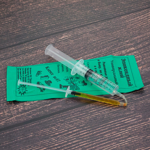 Эпоксидный клей . шприц применяют для склеивания разных деталей из металла, дерева, ПВХ, стекла, керамики, фарфора и других материалов, а также для заливки трещин и сколов. Имеет двухкомпонентный состав на основе отвердителя и эпоксидной смолы, поэтому он быстро затвердевает. Поставляется в двойном шприце на блистере.