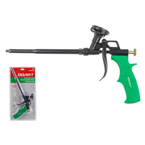 Пистолет для монтажной пены применяется для нанесения монтажной пены, обеспечивая намного более точное дозирование и аккуратное ее нанесение; к тому же пистолет предохраняет содержимое баллона от быстрого затвердевания, позволяя тем самым использовать один баллон спустя значительный промежуток времени (при условии, что он останется подсоединен к пистолету, а клапан подачи пены на пистолете будет перекрыт и не будет доступа кислорода). Корпус и адаптер из алюминиевого сплава, тефлоновое покрытие, никелированный металлический курок, шток и наконечник из нержавеющей стали, тефлоновое покрытие. В комплекте четыре пластиковых насадки-наконечника.
