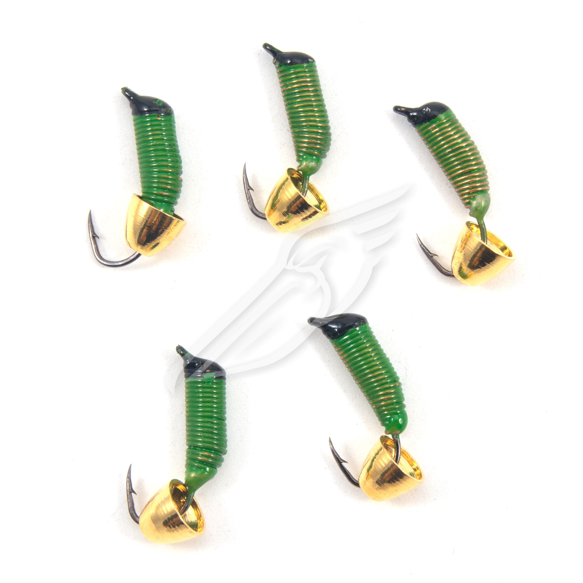 Мормышка вольф. безнасадочная "ЯМАН" Ручейник №5, d-2 мм, L-9.5 мм, вес 0,90 гр., колокол золото, цв. салатовый (уп. 5 шт.)