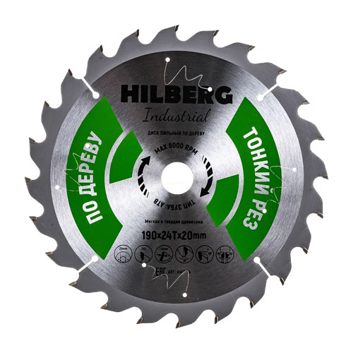 Диск пильный Hilberg Industrial Дерево Тонкий Рез Диаметр: 190; Посадка: 20; Толщина кромки: 1,6; Зубьев: 24; Угол наклона: 18º