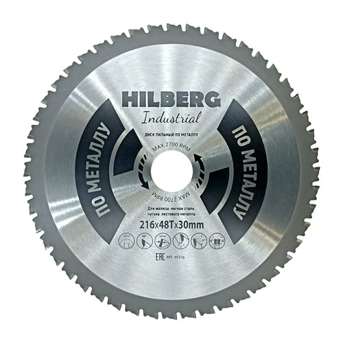 Диск пильный Hilberg Industrial Металл Диаметр: 216; Посадка: 30; Толщина кромки: 1,8; Зубьев: 48; MAX RPM 2700; Угол наклона: 0º.