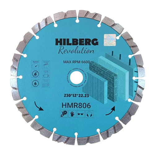 Диск алмазный сегментный-турбо Hilberg Revolution Диаметр: 230; Посадка: 22.23; Высота кромки: 12; Толщина кромки: 2.6; Сегментов: 16; Сухой/мокрый рез.