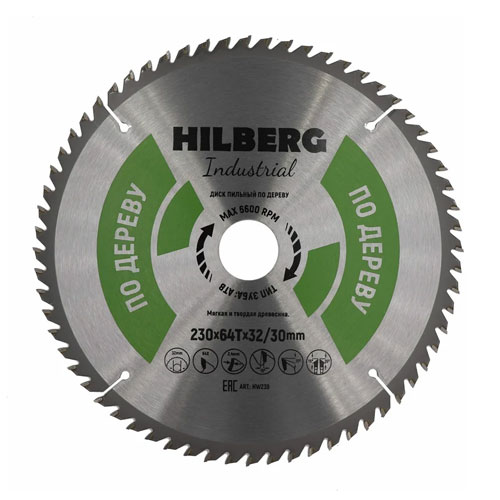 Диск пильный Hilberg Industrial Дерево Диаметр: 230; Посадка: 32/30; Толщина кромки: 2,4; Зубьев: 64; Угол наклона: 15º.