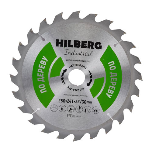 Диск пильный Hilberg Industrial Дерево Диаметр: 250; Посадка: 32/30; Толщина кромки: 2,6; Зубьев: 24; Угол наклона: 15º.