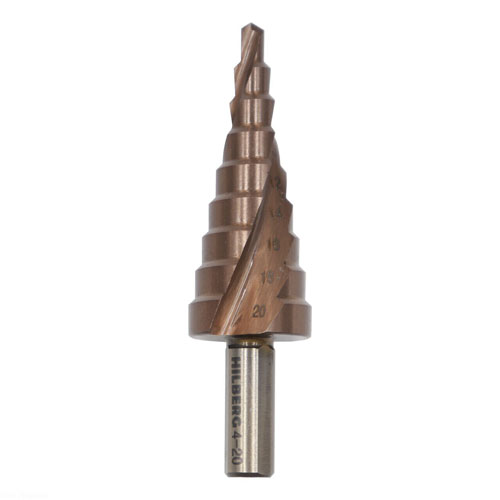Сверло ступенчатое Hilberg HSS-COBALT Диаметры: 4, 6, 8, 10, 12, 14, 16, 18, 20; Ступеней: 9; Шаг ступени: 2; Хвостовик: цилиндрический с тремя гранями.