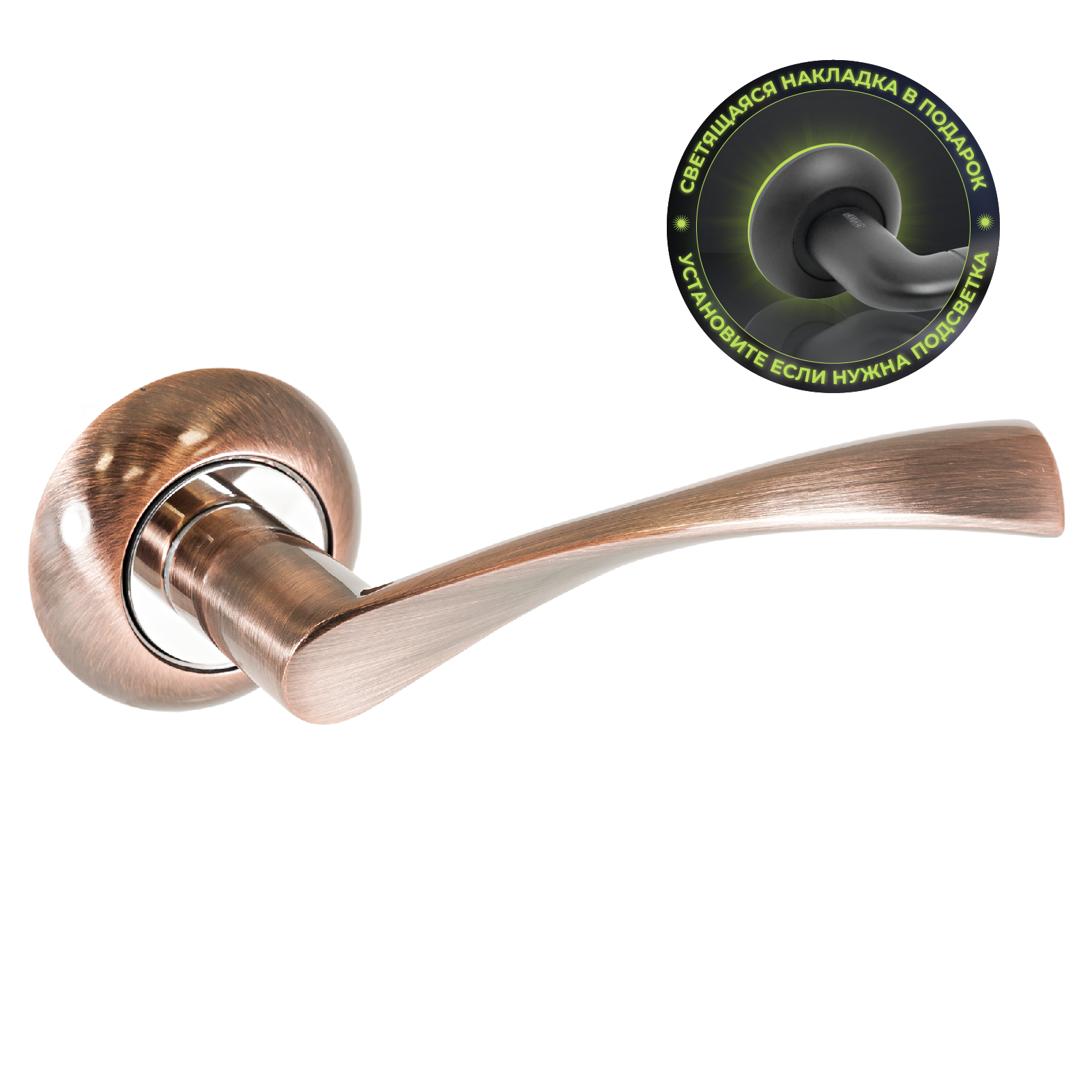 Ручка на круглой накладке.Материал ручек — алюминиевый сплав, накладки — алюминиевый сплав. Многослойное гальваническое покрытие. Отличительная особенность - в комплекте идут пластиковые накладки с люминофором, которые светятся в темноте!!!