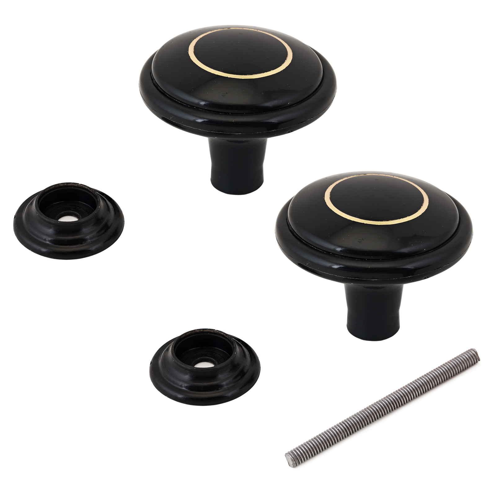 Ручка-кнопка дверная. Материал - пластик. Диаметр ручки - 65 мм, высота ручки - 65 мм. В комплекте соединительный штырь-винт длиной 100 мм. В центре ручки окантовка в виде золотого кольца.