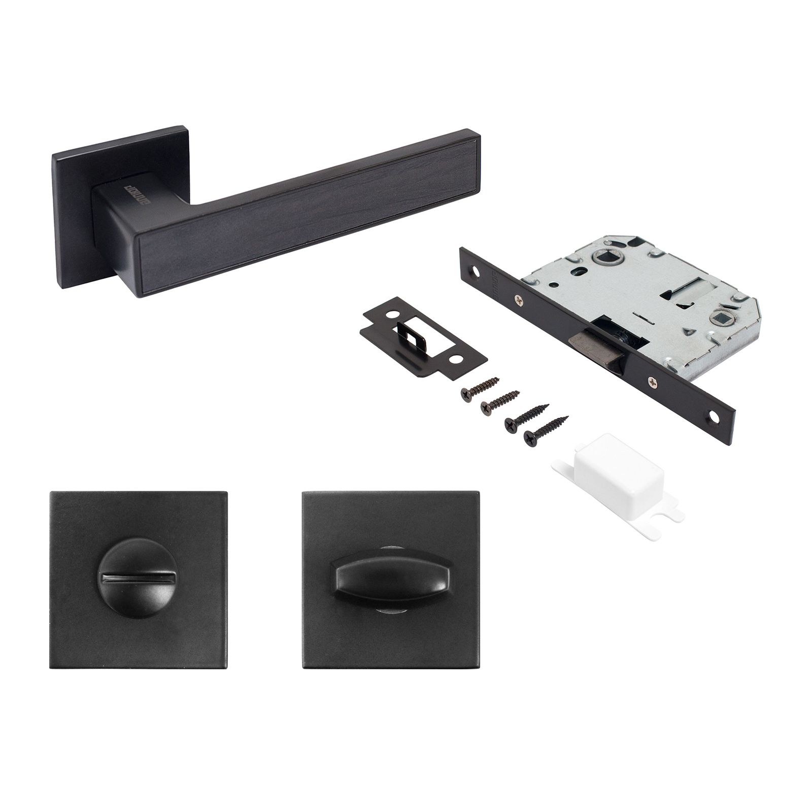 Комплект: ручка на квадратной накладке, сантехническая завертка и защелка с фиксацией .Материал ручек и завертки — алюминиевый сплав, защелки - сталь. Покрытие - полимерная краска. Комплектуются винтовыми стяжками и шурупами. Длина разрезного квадрата - 95мм. Для деревянных дверей, толщиной 35-40 мм. Гарантийный срок эксплуатации — 3 года.
