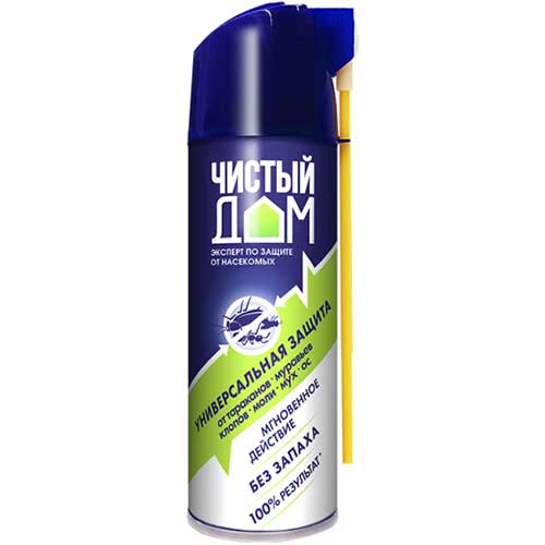 Средство инсектицидное Чистый Дом Аэрозоль Дихлофос от летающих и ползающих насекомых с двойным распылителем представляет собой прозрачную жидкость.