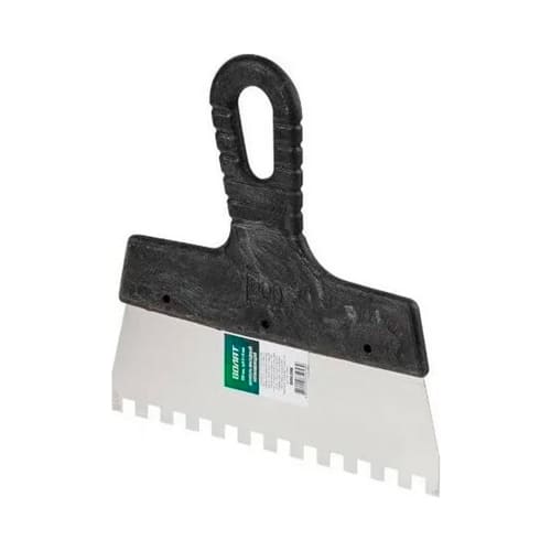 Зубчатый шпатель представляет собой вспомогательный инструмент для ручной укладки плитки. Металлические зубья предназначены для равномерного распределения клея или другой строительной смеси по поверхности укладываемого элемента. Толщину слоя при этом можно варьировать, изменяя степень нажатия на шпатель и угол наклона зубьев. Удобная ручка из пластика имеет отверстие для хранения шпателя в подвешенном положении. Толщина металла 0,43 мм.