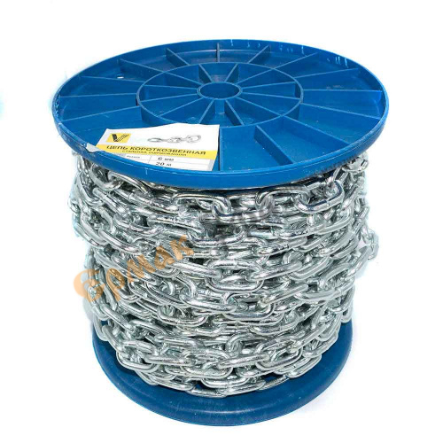 Короткозвенная цепь изготавливается из углеродистой стали класса 2 с цинковым покрытием. Размер цепи от 2 до 16 мм определяется диаметром прутка звена.