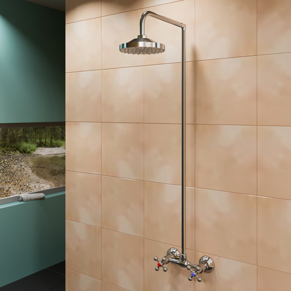 Душевая система с тропическим душем и покрытием хром выполнена из латуни, что обеспечивает её прочность.