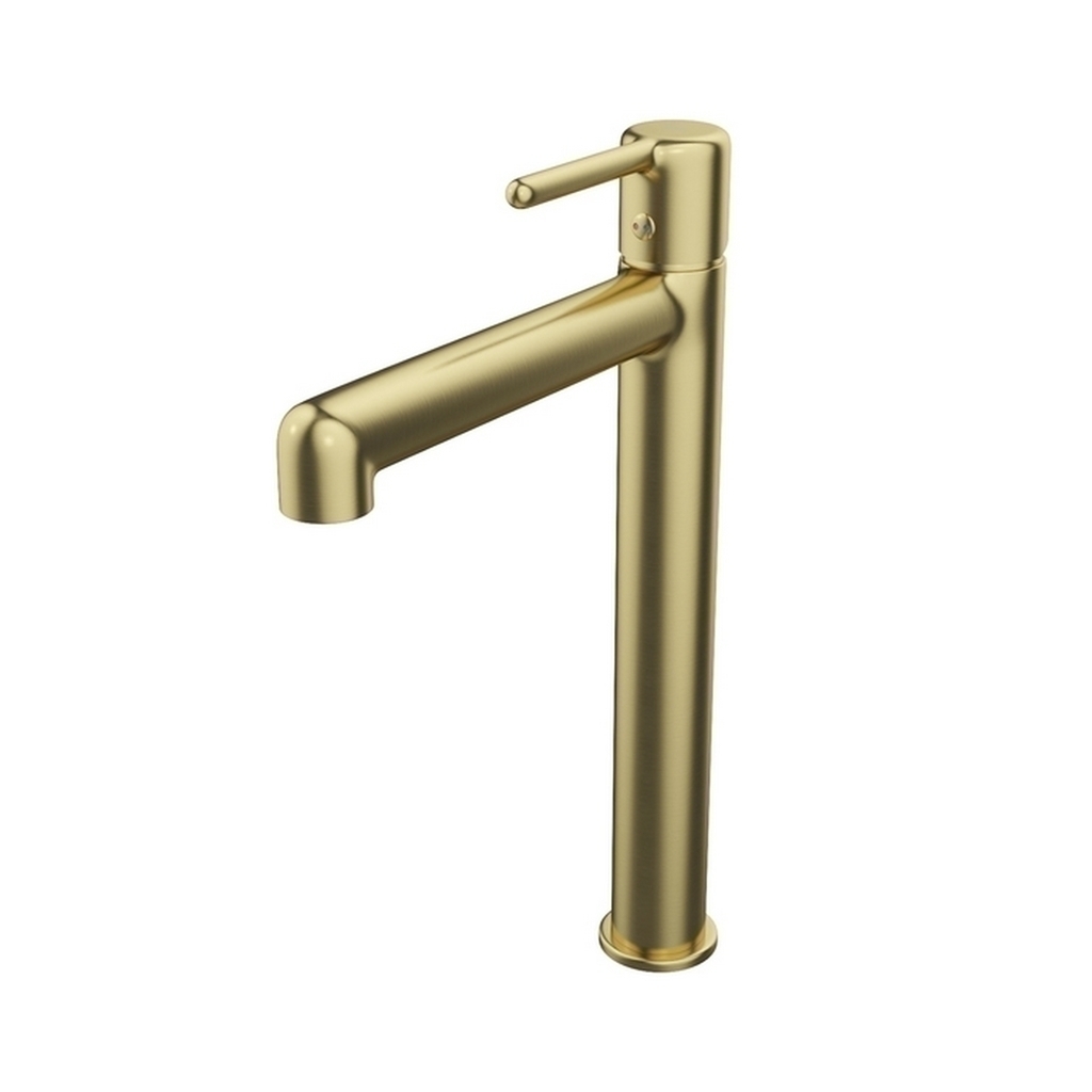 Стильный высокий смеситель для настольного умывальника удачно сочетает актуальный современный дизайн и новый трендовый оттенок матового золота с брашированным покрытием. Тонкая удлиненная ручка добавляет смесителю изящества и комфорт в управлении. Расстояние между ручкой и изливом увеличено для большего удобства.