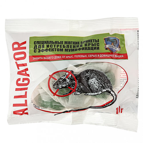 Брикеты АЛЛИГАТОР ООО «ПО ОБОРОНХИМ» рекомендуются для борьбы с крысами (черными, серыми), мышами и другими грызунами. Тесто-брикеты упакованы в индивидуальные пакетики, что облегчает раскладку приманки. Для большего привлечения содержит натуральные пищевые компоненты. Средство обладает высокой родентицидной активностью, гибель грызунов наступает на 2–10 день после поедания приманки. Средство обладает эффектом мумификации после смерти грызуна.