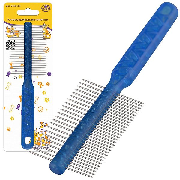 Расческа предназначена для ухода за шерстью животных. Удаляет старую шерсть и грязь, придает шерсти здоровый и пушистый вид. С одной стороны, расческа имеет частые металлические зубчики, а с другой более редкие. Закругленные кончики зубцов бережно воздействуют на кожу питомца, а также создают дополнительный массажный эффект. Такая расческа отлично подойдет для повседневного ухода за шерстью вашего домашнего питомца. Разделите шерсть на несколько участков, расчесывание следует начинать с концов к корням шерсти. Регулярно удаляйте с расчески вычесанную шерсть. Не требует особого ухода, достаточно перед первым использованием помыть мыльным раствором, сполоснуть проточной водой, посушить. Далее мыть по мере загрязнения.