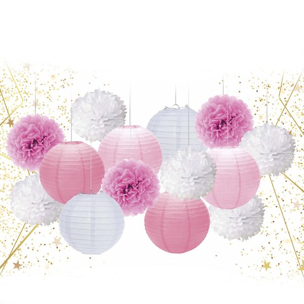 Набор помпонов и фонариков "Весёлый праздник" (14 предметов), Розовый/Белый