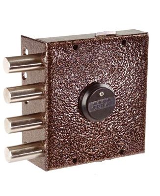 Открывается и закрывается с наружной и внутренней сторон двумя полными оборотами (на 4 фиксируемых положения) комплектного ключа. Засов изготовлен из 4-х стальных стержней круглого сечения, приваренных к пластине ригеля. Базовая комплектация предусматривает защиту от вскрытия замка отмычкой, защиту от высверливания стойки ригеля и защиту от вскрытия методом проворота. Имеет накладку с внутренней стороны на замочной скважине и пластмассовую направляющую под ключ.