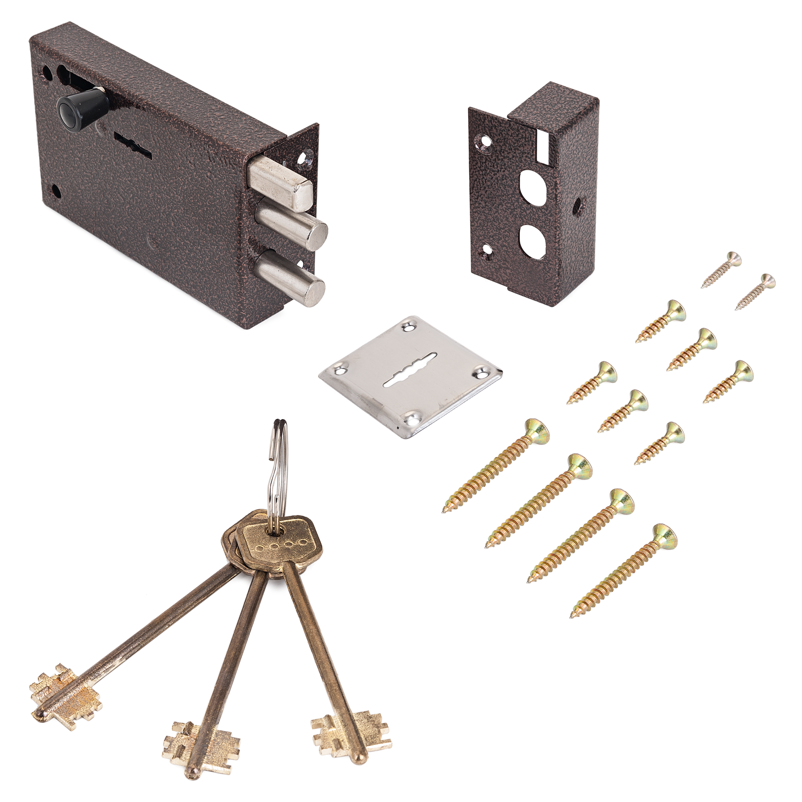 Замок накладной сувальдный. Предназначен для установки на деревянные двери. Засов из трех цилиндрических ригелей диаметром 14 мм, с максимальным вылетом 30 мм. Удаление ключевого отверстия - 60 мм. Количество полуоборотов ключа - 3. Габариты замка - 130х80х24 мм. Комплектация - 5 ключей, пластмассовая направляющая под ключ. Замок имеет защиту от отмычек, от высверливания и от вскрытия методом проворота. Стержни засова замка свободно вращаются, что является защитой от перепиливания.