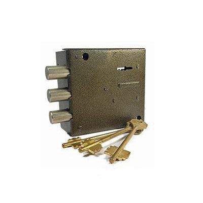 Замок накладной сувальдный. Предназначен для установки на деревянные двери. Засов из трех цилиндрических ригелей диаметром 14 мм, с максимальным вылетом 22 мм. Удаление ключевого отверстия - 76 мм. Габариты замка - 100х105х18 мм. Комплектация - 3 ключа, накладка, торцевая планка.