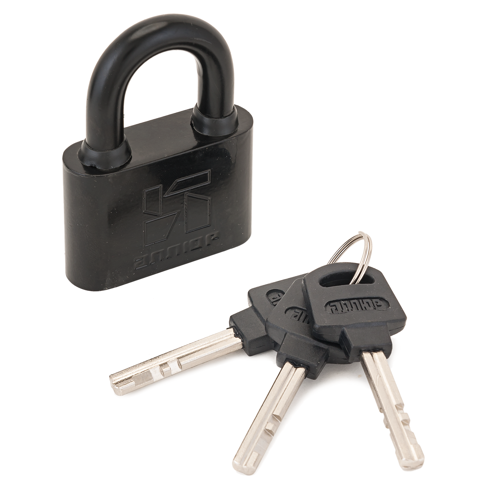 Материал корпуса - сталь, покрытие - черная полимерная краска, дужка - закаленная сталь.