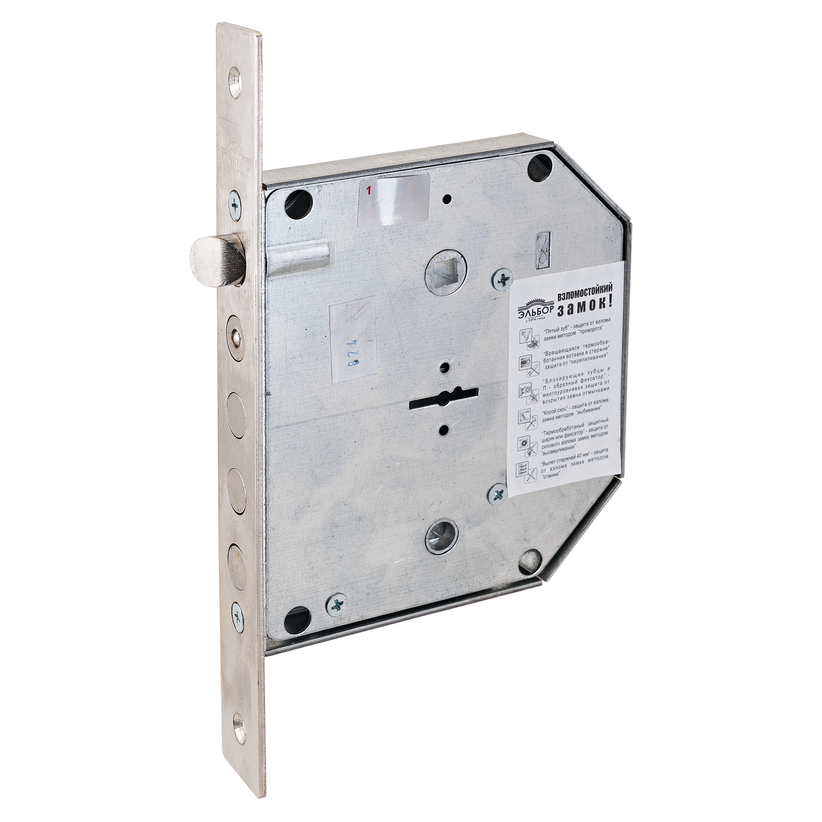 Замок врезной сувальдный с защелкой и задвижкой. Предназначен для металлических дверей. Замок имеет засов из четырех цилиндрических ригелей диаметром 14 мм, с максимальным вылетом 40,4 мм, защелку диаметром 16 мм и задвижку диаметром 14 мм и вылетом 21,5 мм. Удаление ключевого отверстия 68 мм. Межосевое расстояние 42 мм (до защелки) и 47 мм (до задвижки). Количество оборотов ключа - 4. Габариты замка - 137,5х152х20 мм. Комплектация - 5 ключей, съемная торцевая планка, комплект накладок. В одном из ригелей расположен закаленный стальной стержень, обеспечивающий надежную защиту от перепиливания. Защита от криминального и силового взлома, высверливания, выдавливания.