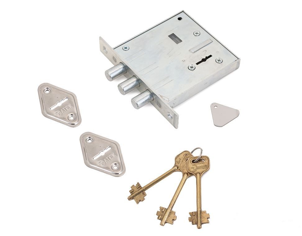Комплектация:накладка оцинкованная, запорная планка, комплект ключей - латунь (3,4,5 шт.), паспорт.