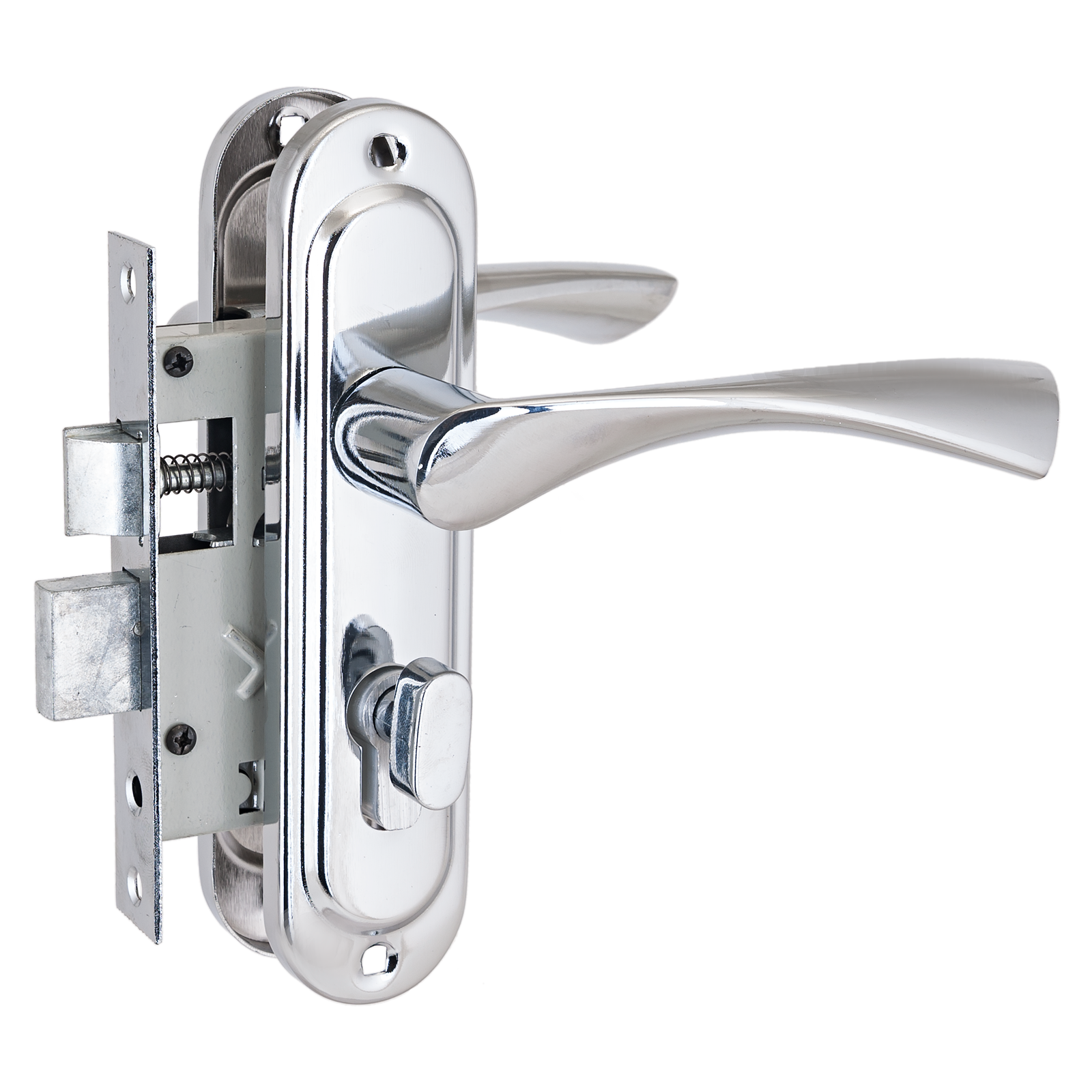 Замок врезной с ручками. Предназначен для установки в деревянные двери толщиной до 40мм, правого и левого открывания. Дверь может быть закрыта на защелку и открыта с помощью фалевой ручки при открытом засове замка.
