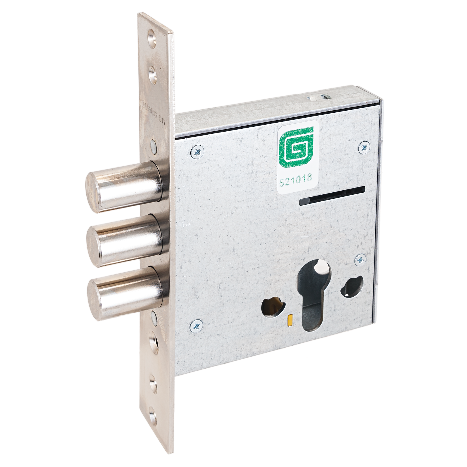 Три цилиндрических ригеля, диаметром 15,8мм, вылет 26мм. Удаление ключевого отверстия 65мм. Стальная торцевая планка, покрытие - никель, ширина планки 30мм.